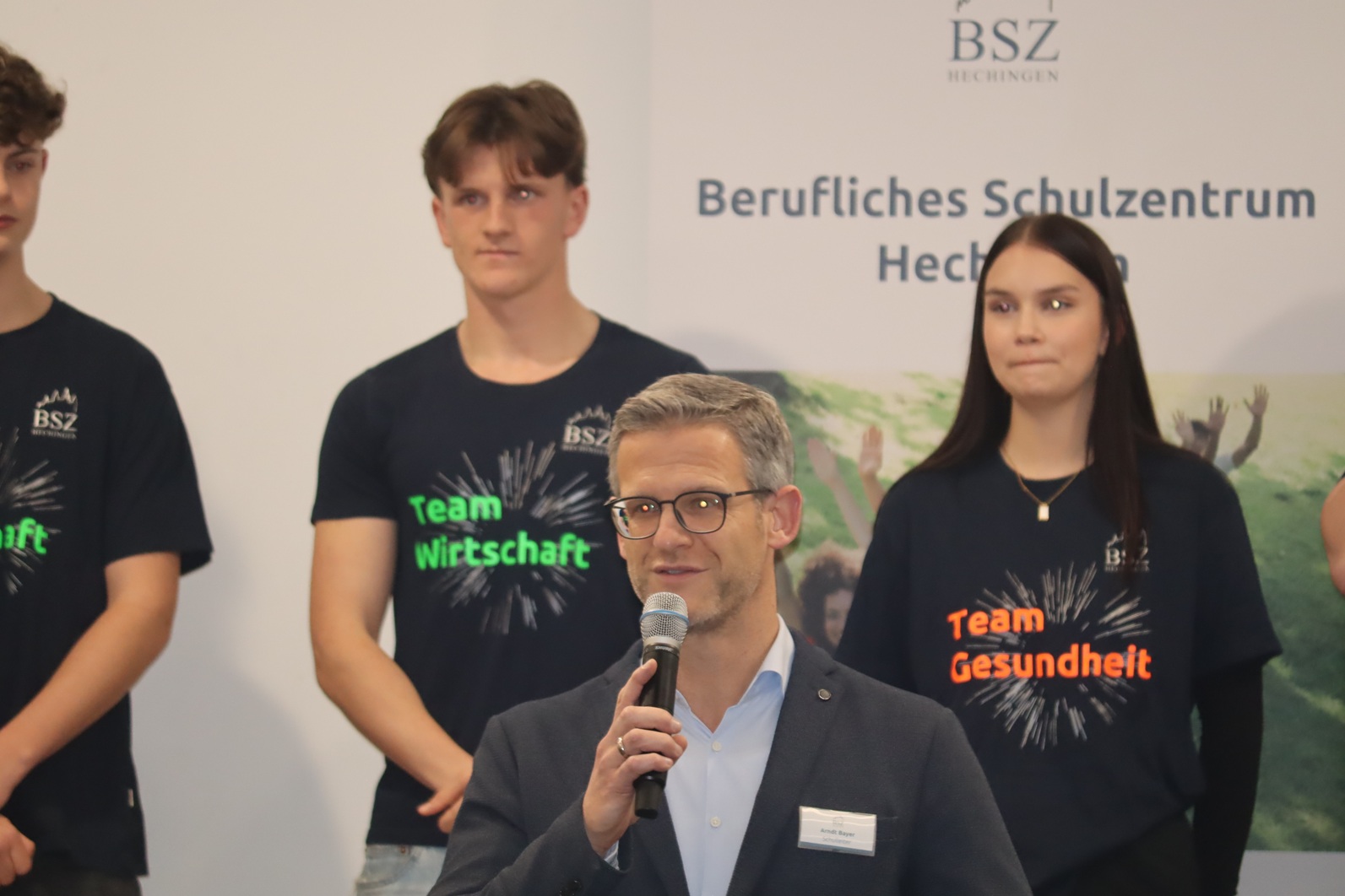 Gut besucht war der Abend des Beruflichen Gymnasiums, zu dem das Berufliche Schulzentrum Hechingen (BSZ) in den Neubau am Schlossberg. geladen hatte. Etwa zweihundert Schülerinnen und Schüler aus Realschulen und aus allgemeinbildenden Gymnasien sowie deren Eltern wurden von Schulleiter Arndt Bayer, Abteilungsleiter Martin Walczok sowie den Moderatoren des Abends, Ronja Bentele und Philipp Fähnrich, willkommen geheißen. „Sie befinden sich gerade in einer Orientierungsphase. Mit dem heutigen Infoabend möchten wir Ihnen zu einem doppelten Erkenntnisgewinn verhelfen“, richtete Bayer das Wort an das Publikum. „Sie werden heute hoffentlich alles zu den Hardfacts unseres Gymnasiums erfahren, also Zugangsvoraussetzungen, Bewerbungsverfahren und Bildungsplänen. Ich hoffe aber auch, sie bekommen heute ein Gefühl für die Softfacts: Was für eine Haltung wir Lehrkräfte unseren Schülerinnen und Schülern gegenüber haben, wie die Atmosphäre an der Schule ist“, sagte Bayer.