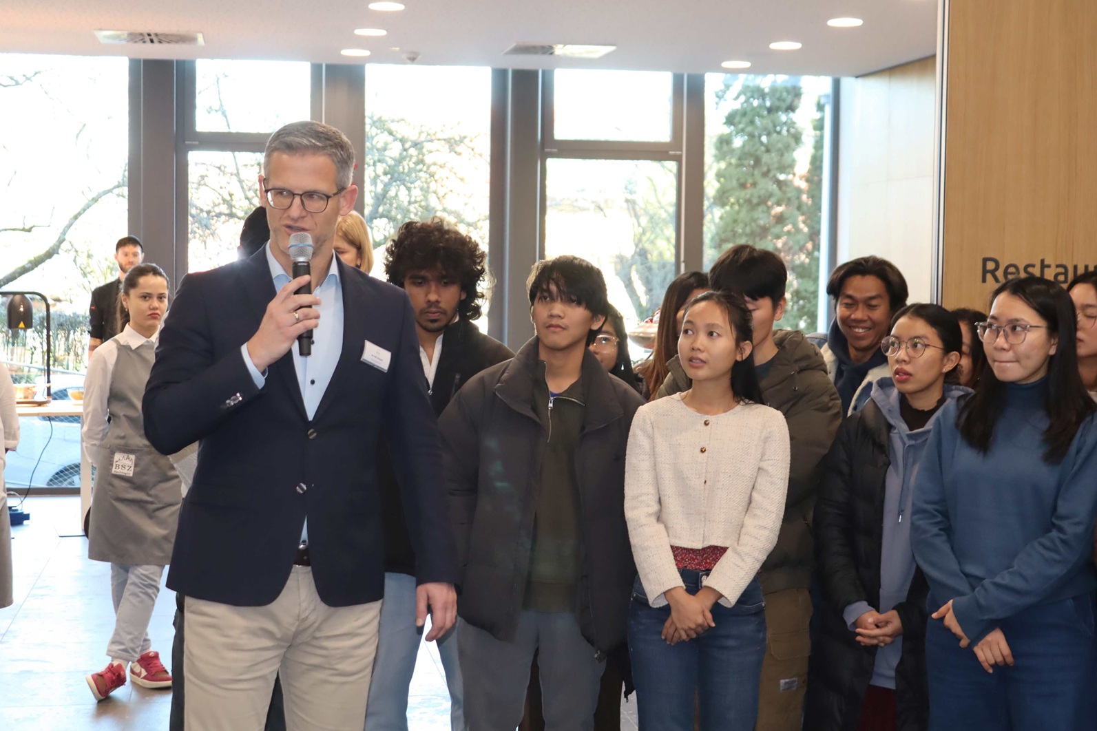 Nach den Begrüßungen genossen die Azubis, die Gäste sowie die Lehrkräfte der Klasse das Mittagessen, das Auszubildende der Gastronomie unter Anleitung von Norbert Boos und Bettina Kurz zubereiteten und servierten. Bei diesem berichtete Hsu Nandar Htet, wie gut ihr Deutschland und die Ausbildung gefallen. „Besonders begeistert mich die Verknüpfung von Theorie und Praxis. Auch die tollen Zukunftsperspektiven finde ich super“, so Nandar Htet. Sie vermisse bis auf das gewohnte Essen bisher eigentlich nichts, selbst die Familie fehle ihr nach erst zwei Monaten in Deutschland eigentlich kaum. Nur mit der Sprache, speziell dem Schwäbischen tue sie sich noch schwer. Allerdings habe sie immerhin schon „Käpsele“, „Jetzetle“ und „Muggeseggele“ drauf. Auch Aye Chan Paing Oo sieht sich bestens in Deutschland angekommen: „Dass wir hier sind, ist doch wirklich eine Win-Win-Situation: Deutschland bekommt neue Pflegekräfte und wir ein besseres Leben als in Myanmar“, so Chan Paing Oo.