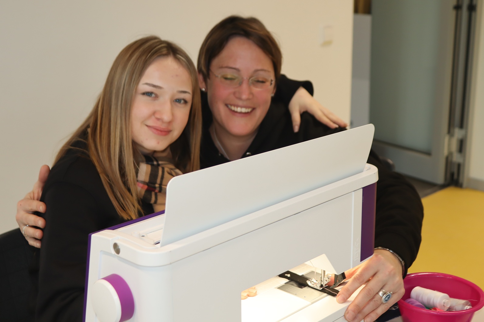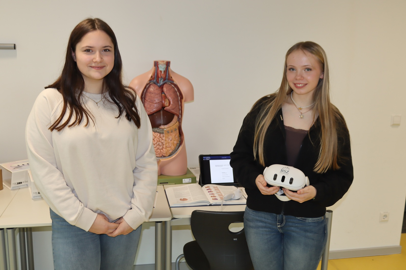 Sehr gerne wurden dabei verschiedene Mitmachangebote angenommen. VR-Brillen, mit denen das menschliche Skelett samt Muskelapparat studiert werden konnte, Quizze zu verschiedenen Fächern bis hin zum fachgerechten Wickeln von Puppen, für alle Interessen war etwas dabei. So auch für Madeline Gregus, die gerade noch die 9. Klasse der Sichelschule in Balingen besucht. Sie informierte sich genauer über das AVdual und das Profil Hauswirtschaft. Dass sie dabei gleich praktisch aktiv werden und einen Schlüsselanhänger nähen konnte, machte ihr sichtlich Spaß: „Mir gefällt es hier richtig gut. Ich denke, das wird meine neue Schule“, meinte sie daher auch. Ihre begleitende Lehrerin Swenja Koschruck berichtete, dass die Schülerinnen und Schüler der 9. und 10. Klasse an der Sichelschule wählen dürfen, ob sie am Infotag nach Balingen, Albstadt oder Hechingen gehen wollen. „Einige entscheiden sich dabei bewusst für das BSZ. Es hat einen guten Ruf, bestimmte Profile sind hier für einige interessant, aber auch Freunde, die hier schon zur Schule gehen, spielen eine Rolle“, so Koschruck. Das Profil „Gesundheit und Pflege“ war für Aliyah Wornath und Maria Köhn ausschlaggebend, nach Hechingen zu kommen. „Wir möchten nächstes Jahr hier im Berufskolleg weitermachen“, meinten die beiden und waren vom Infotag begeistert.